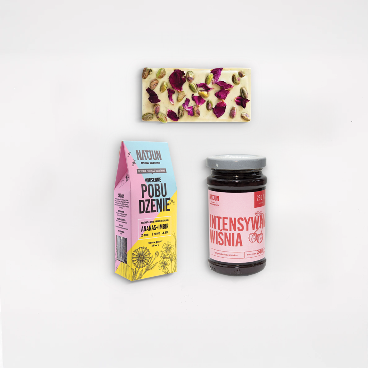 • Biała czekolada z pistacjami i różą – ręcznie robiona czekolada o delikatnym, kremowym smaku z wyraźną nutą pistacji i subtelnym aromatem kwiatów.