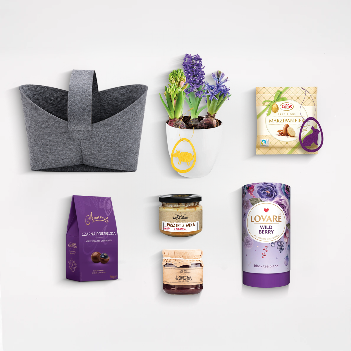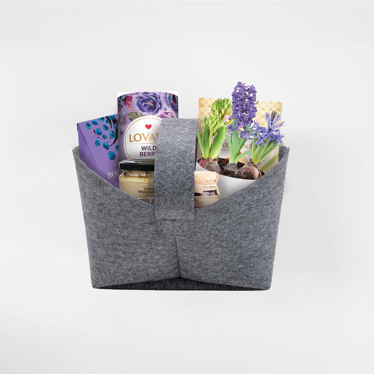 Żywy kwiat w doniczce symbolizuje nowy początek i wiosenne odrodzenie, a dodatki spożywcze idealnie wpisują się w klimat wielkanocnego stołu. Całość zapakowana jest w estetyczny filcowy koszyk, który czyni zestaw praktycznym również po świętach.